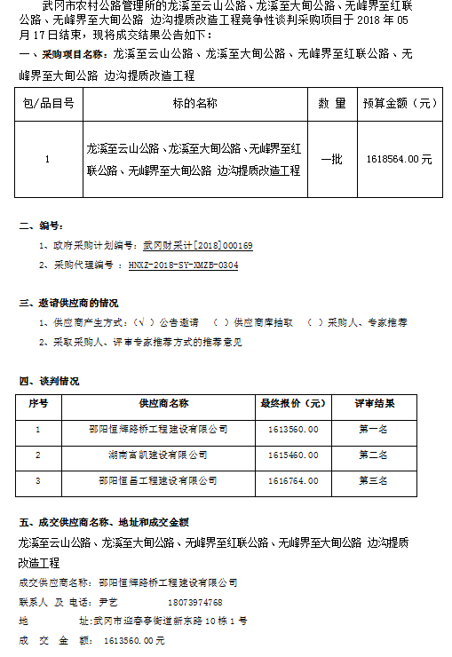 龙溪至云山公路、龙溪至大甸公路、无峰界至红联公路、无峰界至大甸公路 边沟提质改造工程竞争性谈判成交结果公告