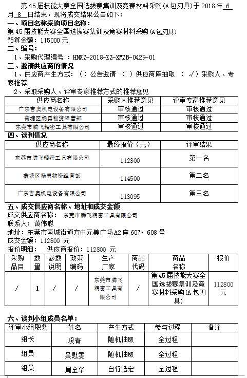 第45届技能大赛全国选拔赛集训及竞赛材料采购 (A包刃具) 竞争性谈判成交公告