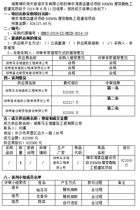 神农湾酒店建设项目800kVA增容配电工程建筑项目 竞争性谈判成交公告