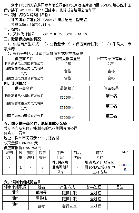 神农湾酒店建设项目800kVA增容配电工程安装 竞争性谈判成交公告