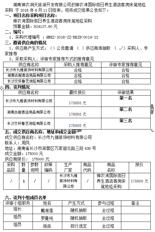 神农湾国际假日养生酒店客房床尾地毯采购 竞争性谈判成交公告