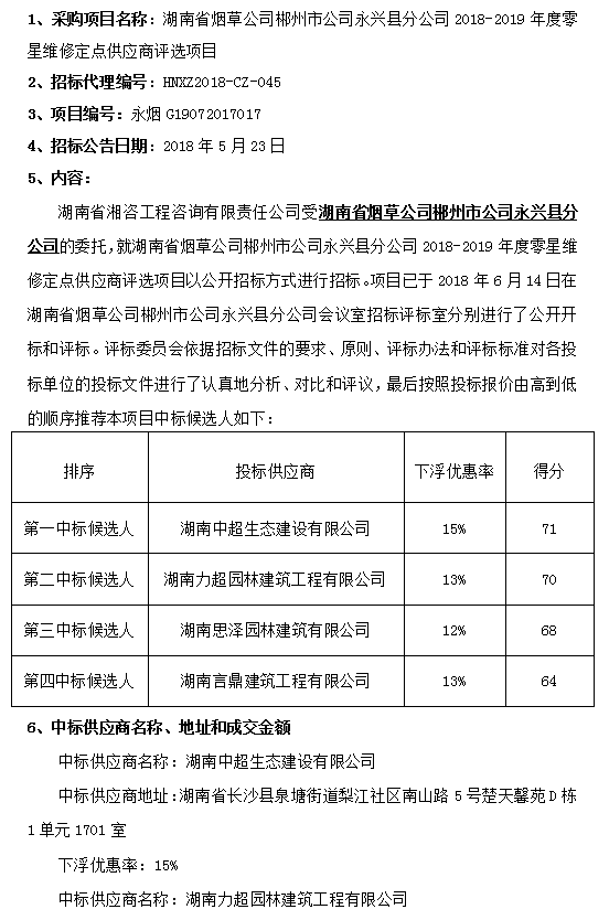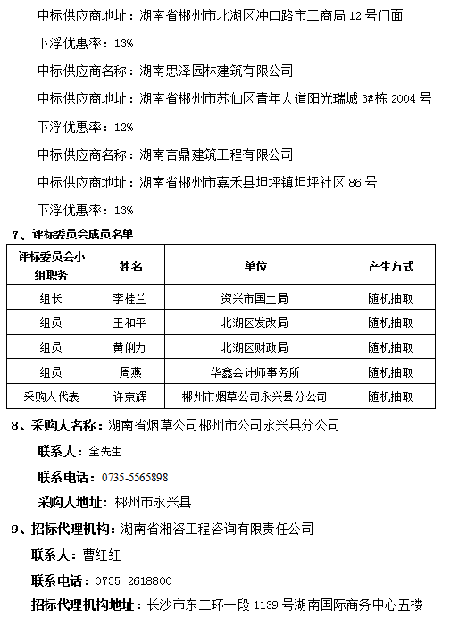 湖南省烟草公司郴州市公司永兴县分公司2018-2019年度零星维修定点供应商评选项目结果公示