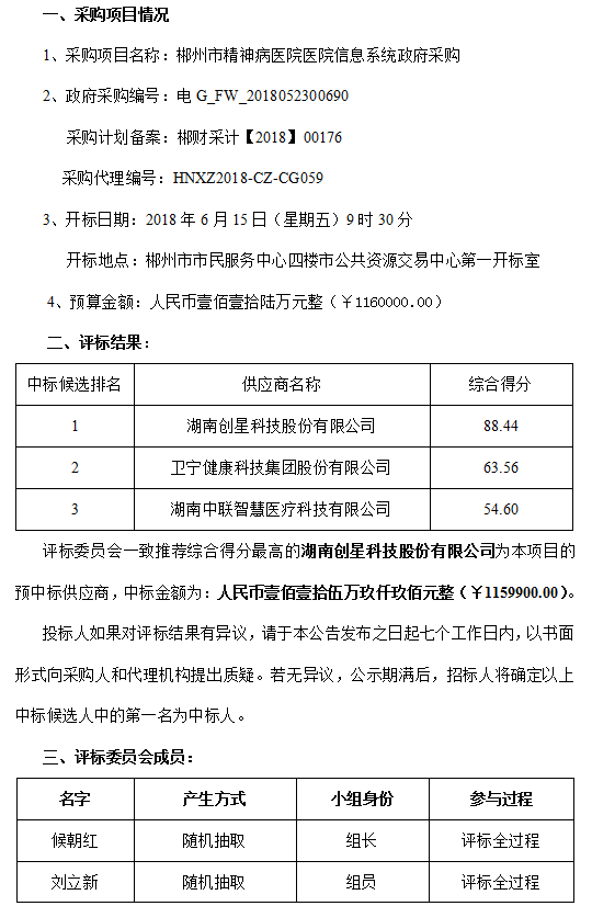 郴州市精神病医院医院信息系统政府采购 中标结果公示
