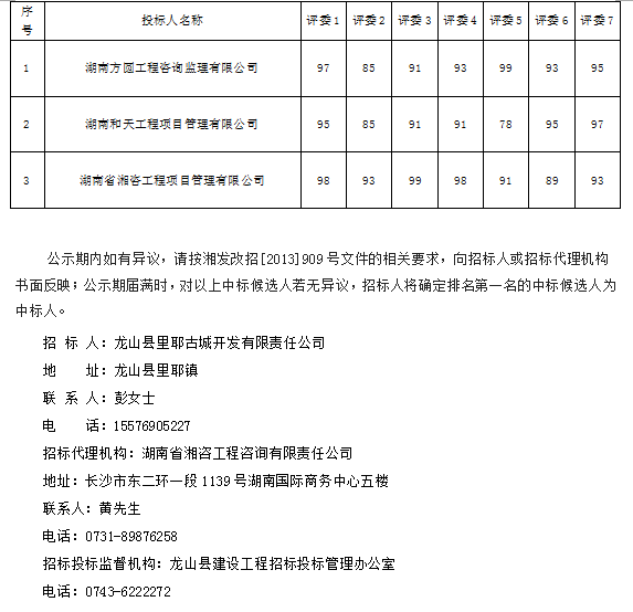 龙山县里耶古城南游客服务中心(含拆迁安置区)二期工程监理 招标投标信息公示表