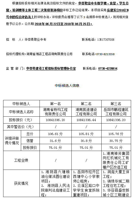 华容职业中专教学楼、食堂、学生公寓、培训楼等主体工程二次装修装饰项目中标候选人公示
