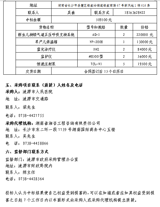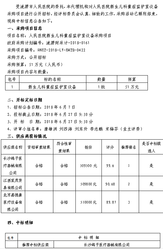 人民医院新生儿科重症监护室设备采购项目 中标结果公告
