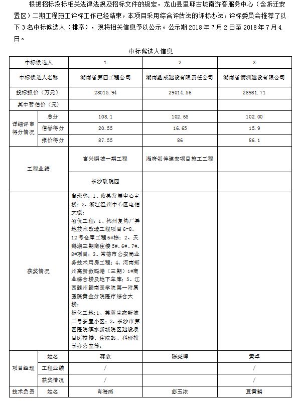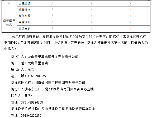 龙山县里耶古城南游客服务中心(含拆迁安置区)二期工程 招标投标信息公示表