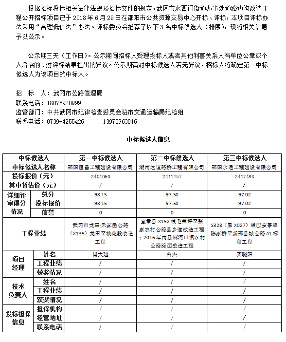 武冈市水西门街道办事处道路边沟改造工程 中标候选人公示