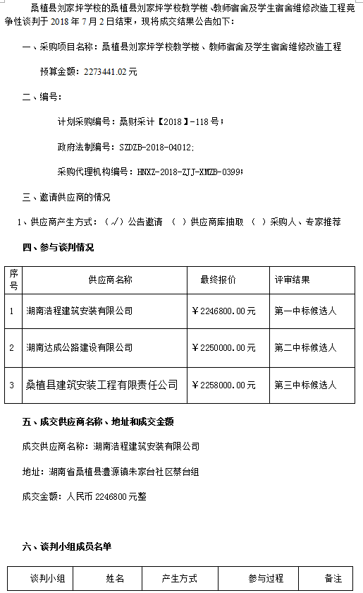 桑植县刘家坪学校教学楼、教师宿舍及学生宿舍维修改造工程竞争性谈判成交结果公告