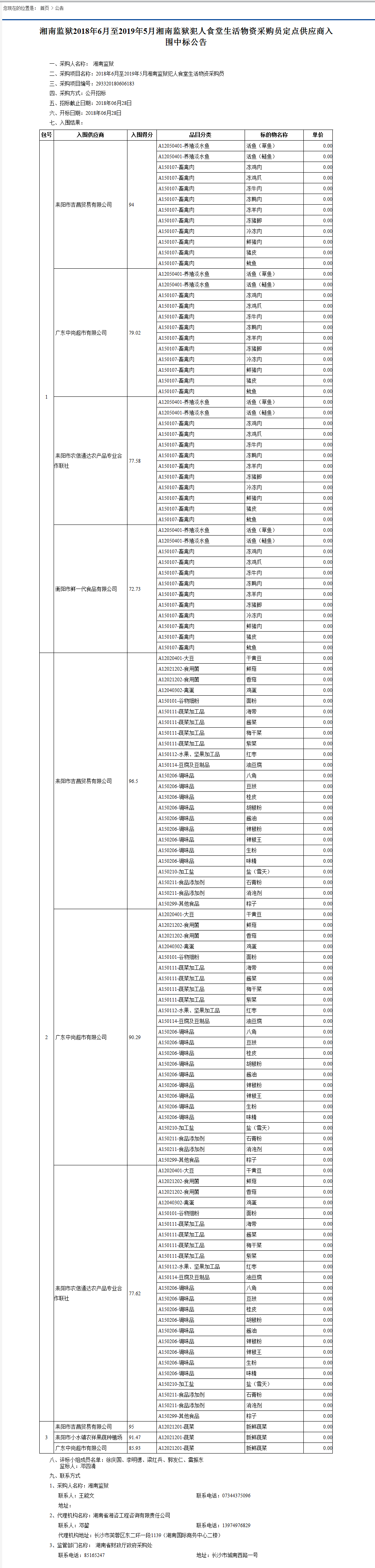 湘南监狱2018年6月至2019年5月湘南监狱犯人食堂生活物资采购员定点供应商入围中标公告