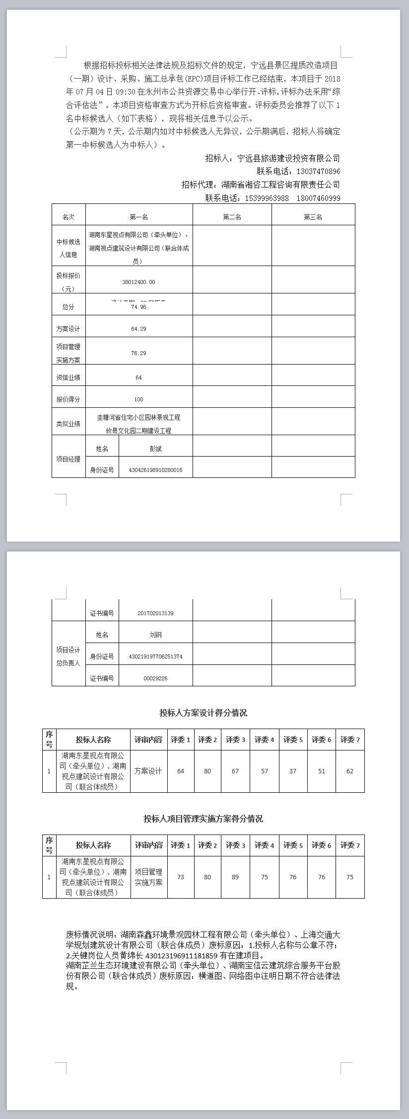 宁远县景区提质改造项目(一期)设计、采购、施工总承包(EPC)项目中标候选人公示