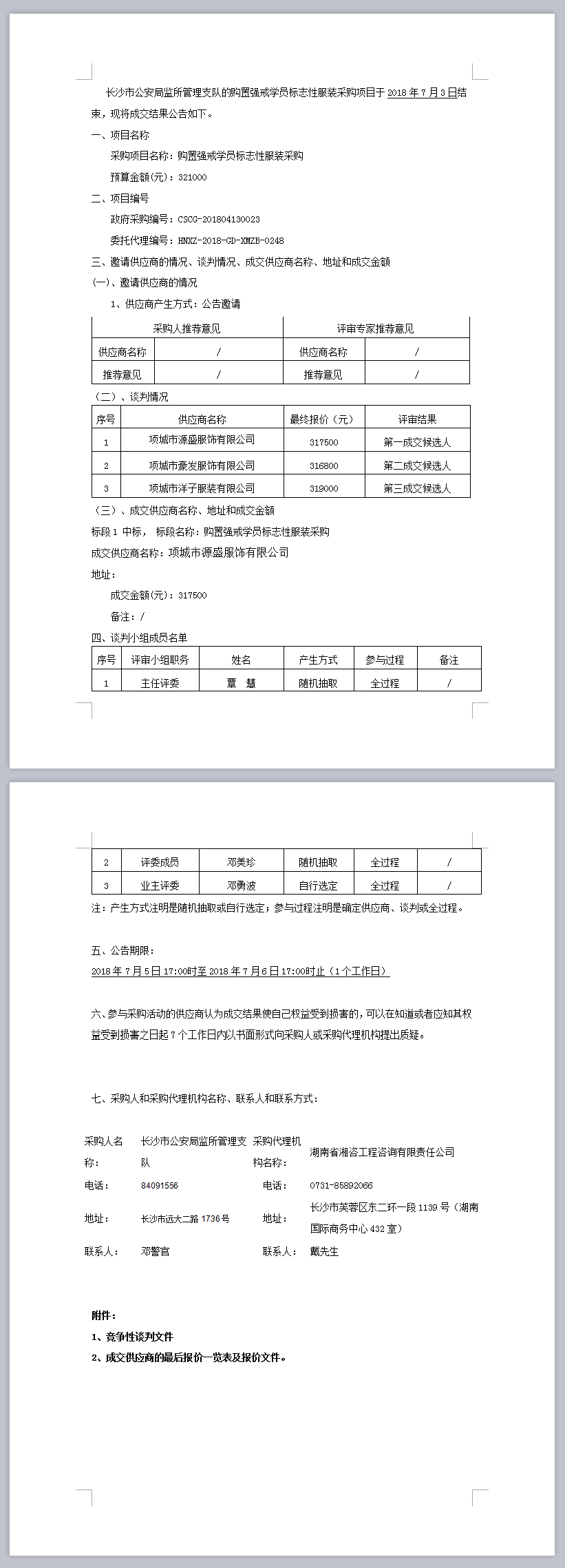 长沙市公安局监所管理支队购置强戒学员标志性服装采购结果公告