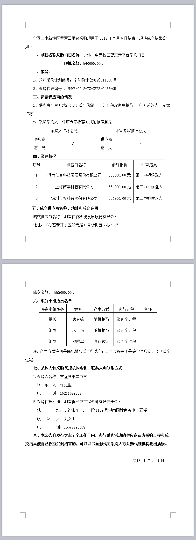 宁远二中新校区智慧云平台采购项目竞争性谈判成交结果公告