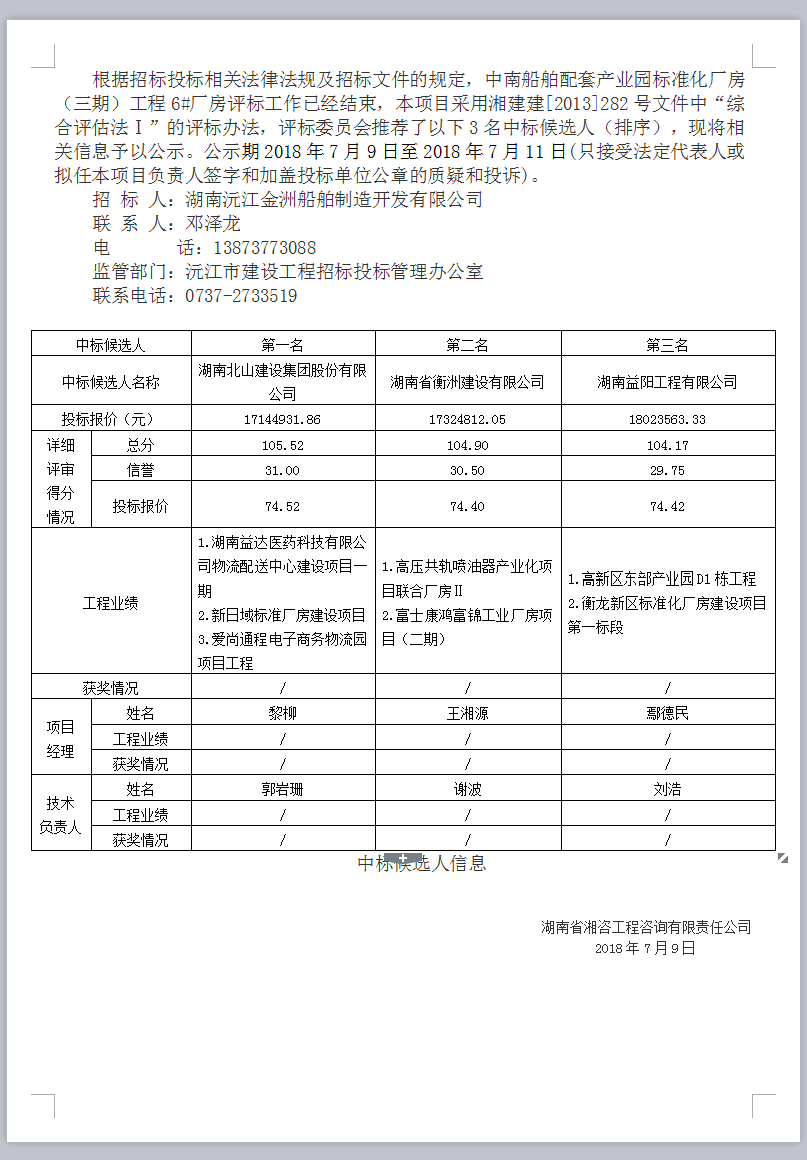 中南船舶配套产业园标准化厂房(三期)工程6#厂房中标候选人公示