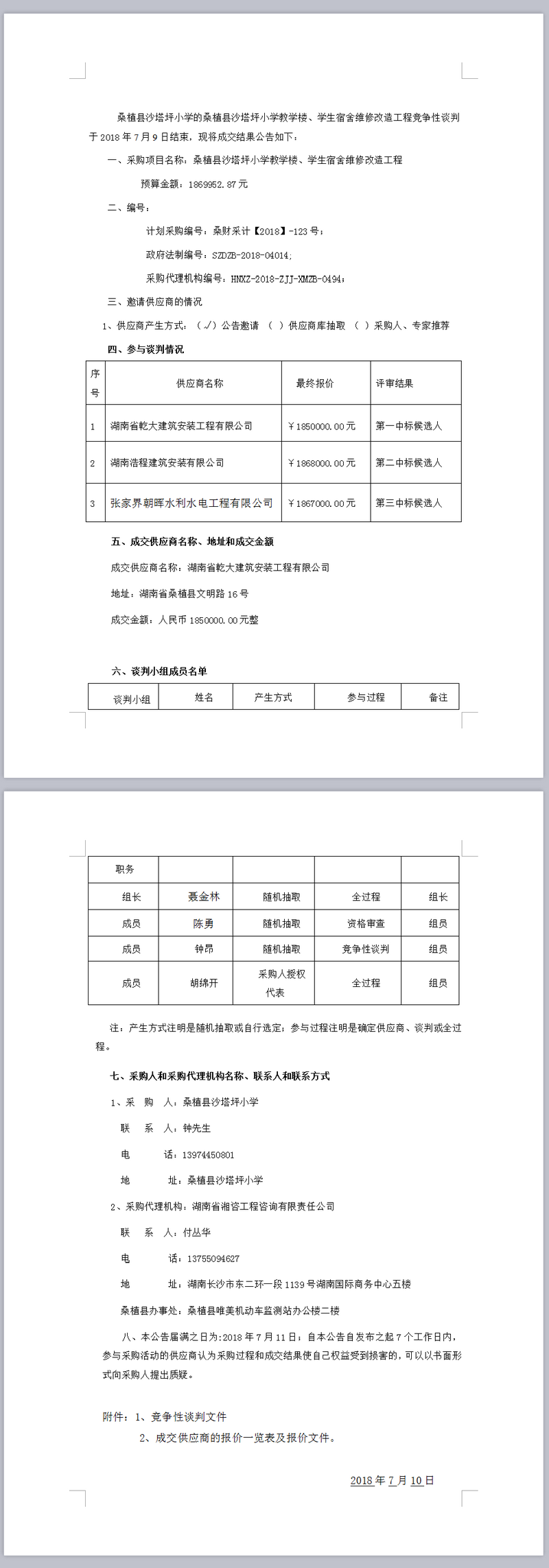桑植县沙塔坪小学教学楼、学生宿舍维修改造工程谈判成交公告