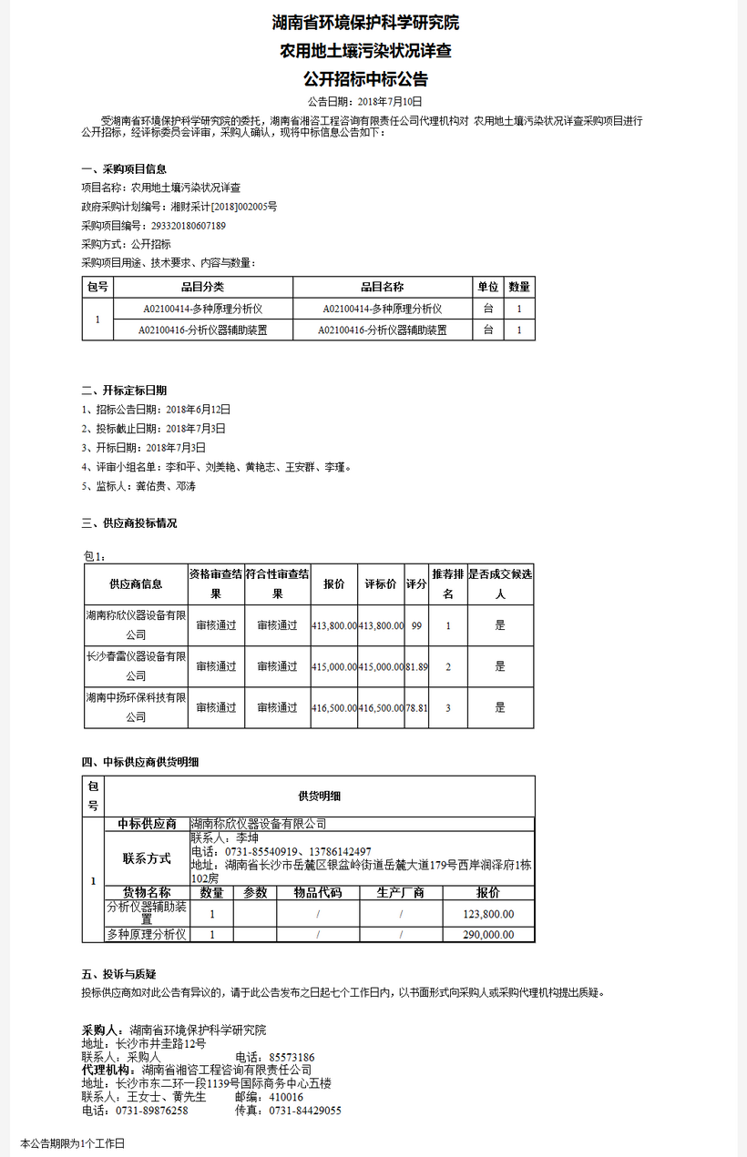 湖南省环境保护科学研究院农用地土壤污染状况详查公开招标中标公告