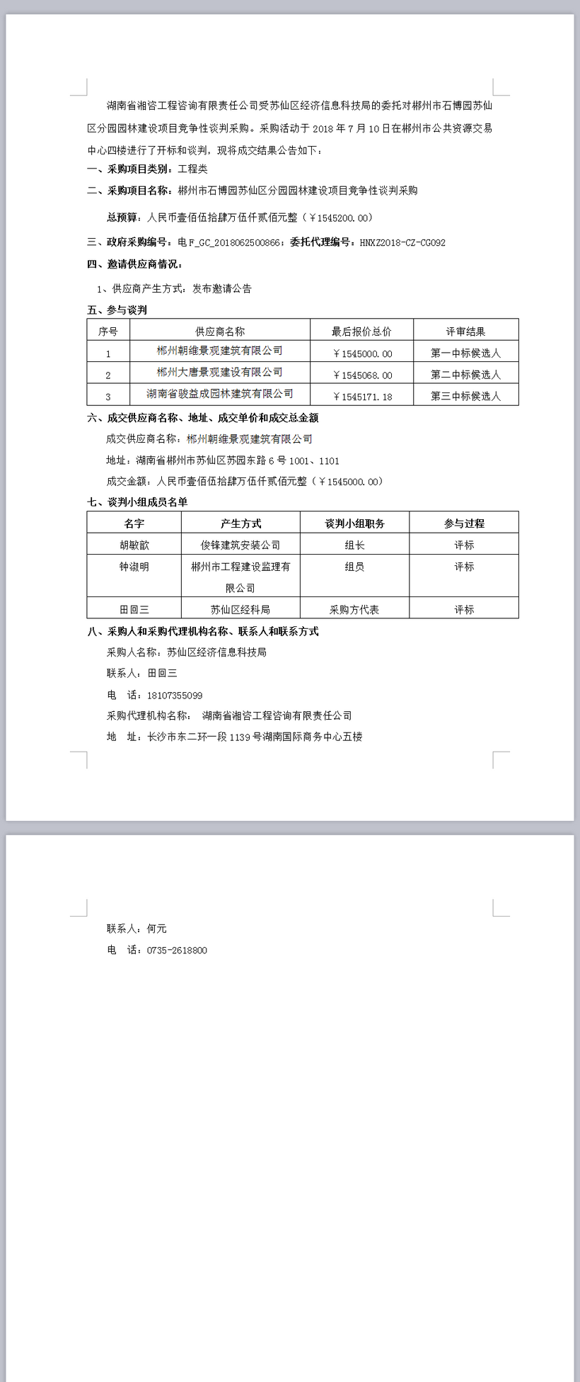 郴州市石博园苏仙区分园园林建设项目竞争性谈判采购成交公告