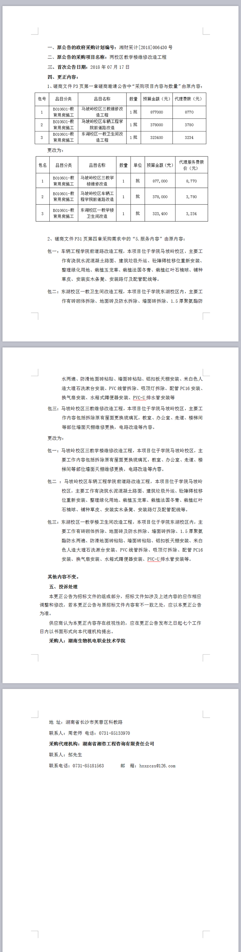 湖南生物机电职业技术学院两校区教学楼维修改造工程项目竞争性磋商更正公告
