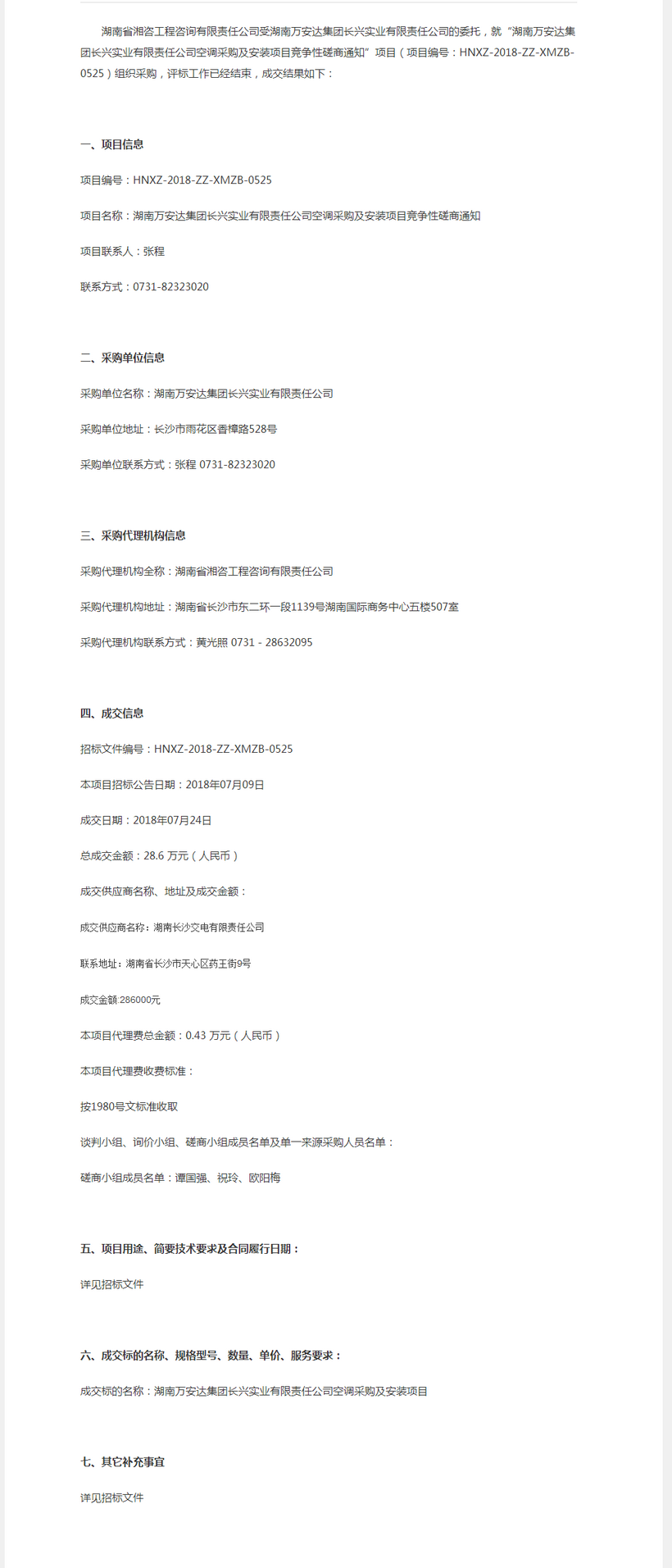 湖南万安达集团长兴实业有限责任公司空调采购及安装项目竞争性磋商通知成交公告