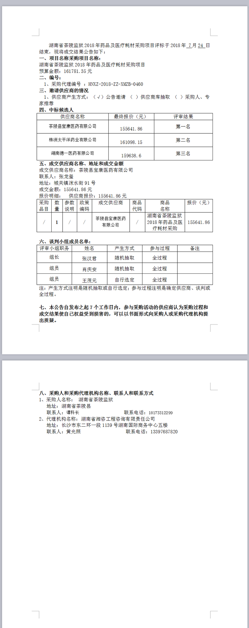 湖南省茶陵监狱2018年药品及医疗耗材采购项目成交公告