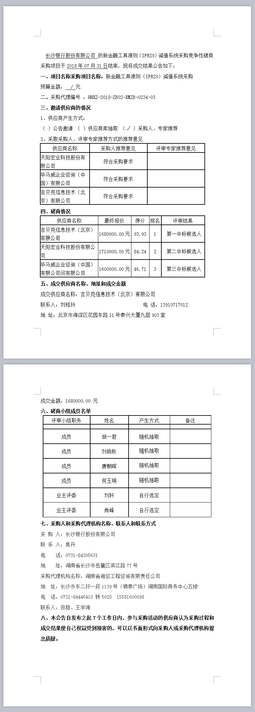 新金融工具准则(IFRS9)减值系统采购竞争性磋商成交公告