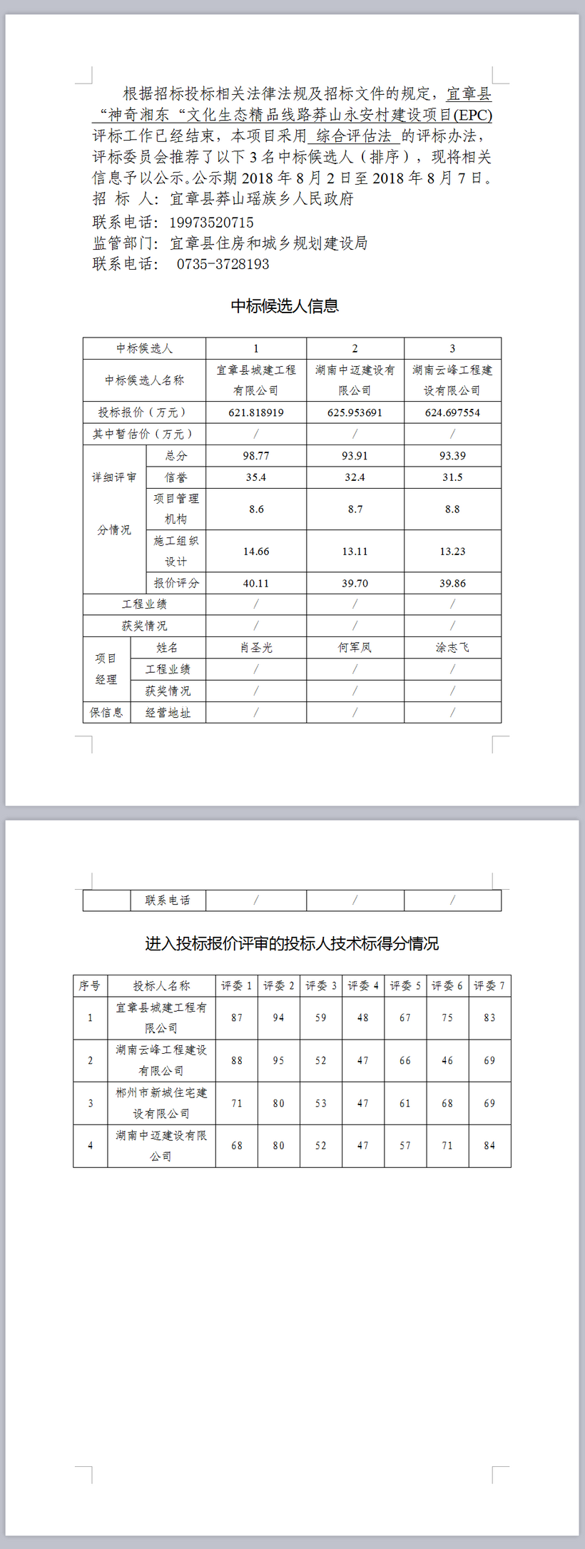 宜章县“神奇湘东“文化生态精品线路莽山永安村建设项目(EPC) 中标候选人公示