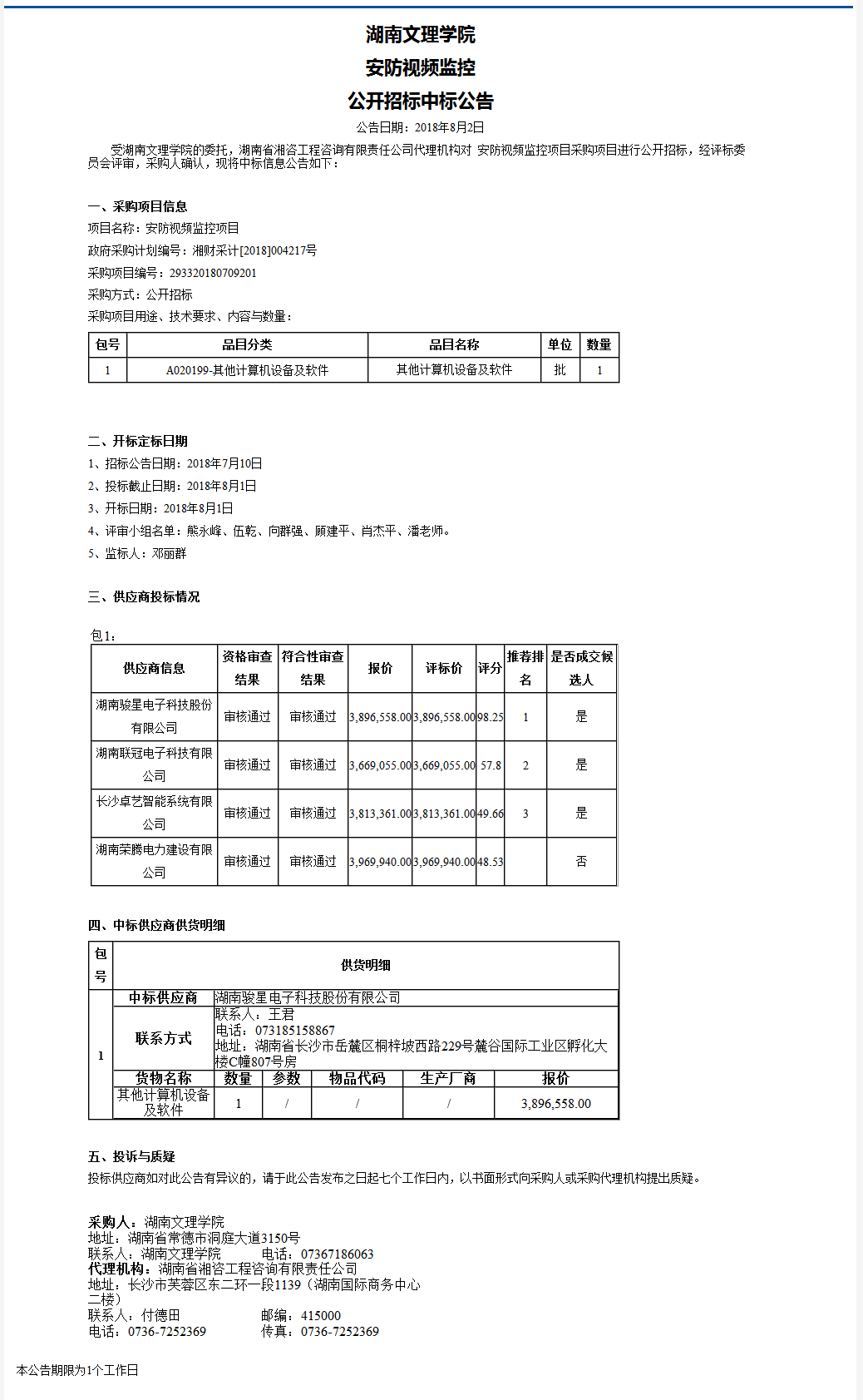 湖南文理学院安防视频监控公开招标中标公告