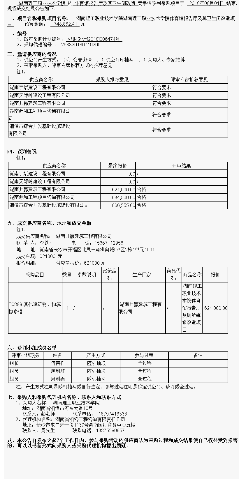 湖南理工职业技术学院湖南理工职业技术学院体育馆报告厅及其卫生间改造项目竞争性谈判成交公告