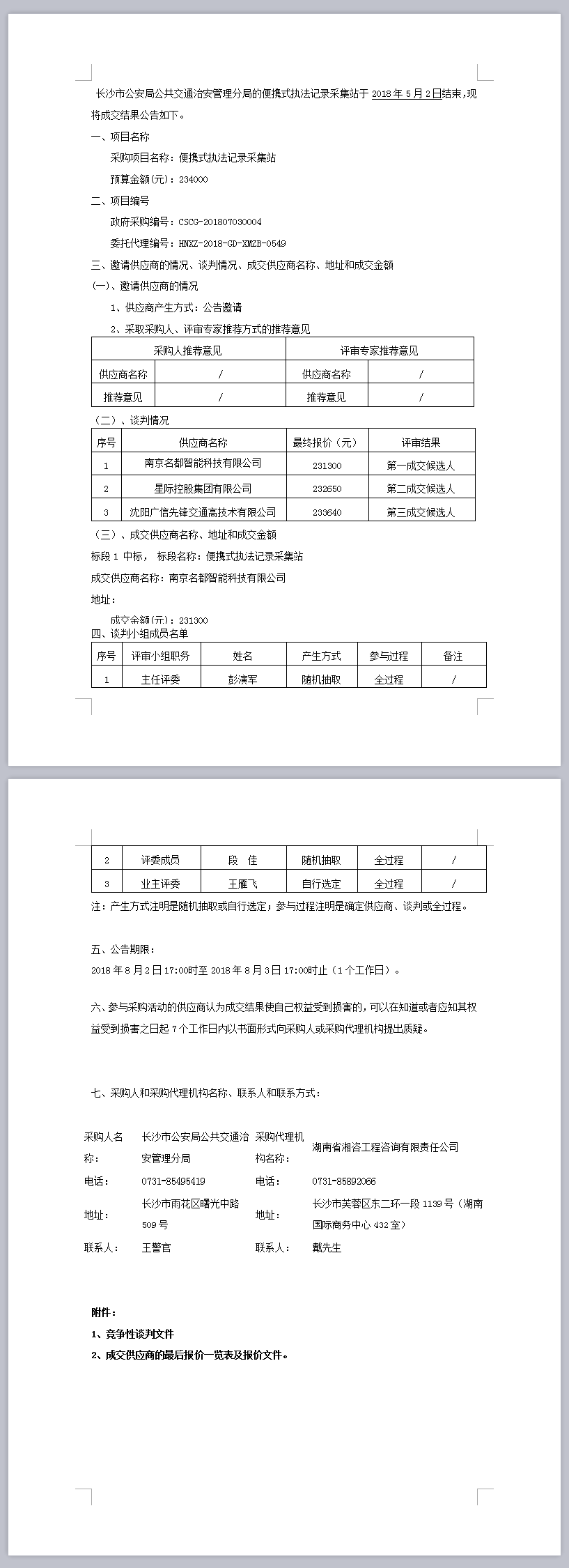长沙市公安局公共交通治安管理分局便携式执法记录采集站结果公告