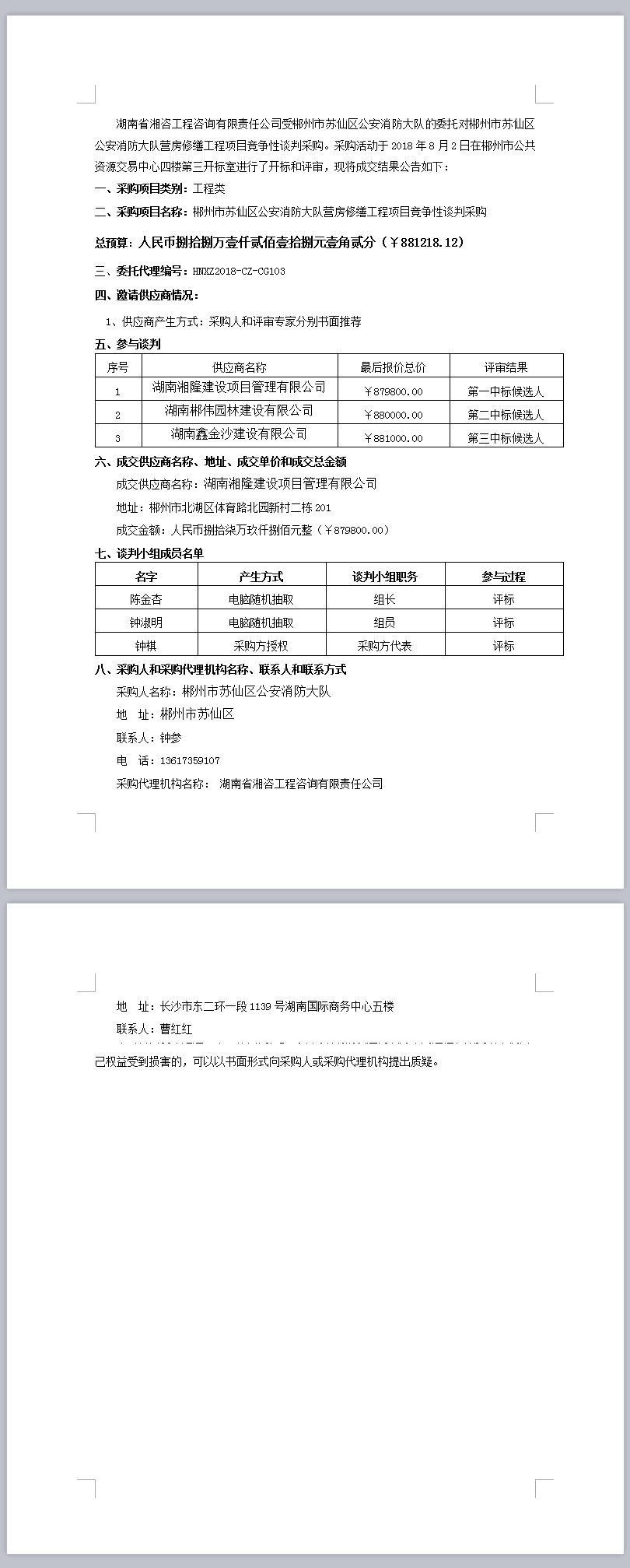 郴州市苏仙区公安消防大队营房修缮工程项目竞争性谈判采购成交公告