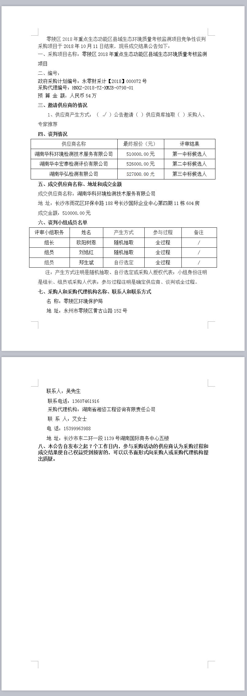 零陵区2018年重点生态功能区县域生态环境质量考核监测项目 竞争性谈判成交公告