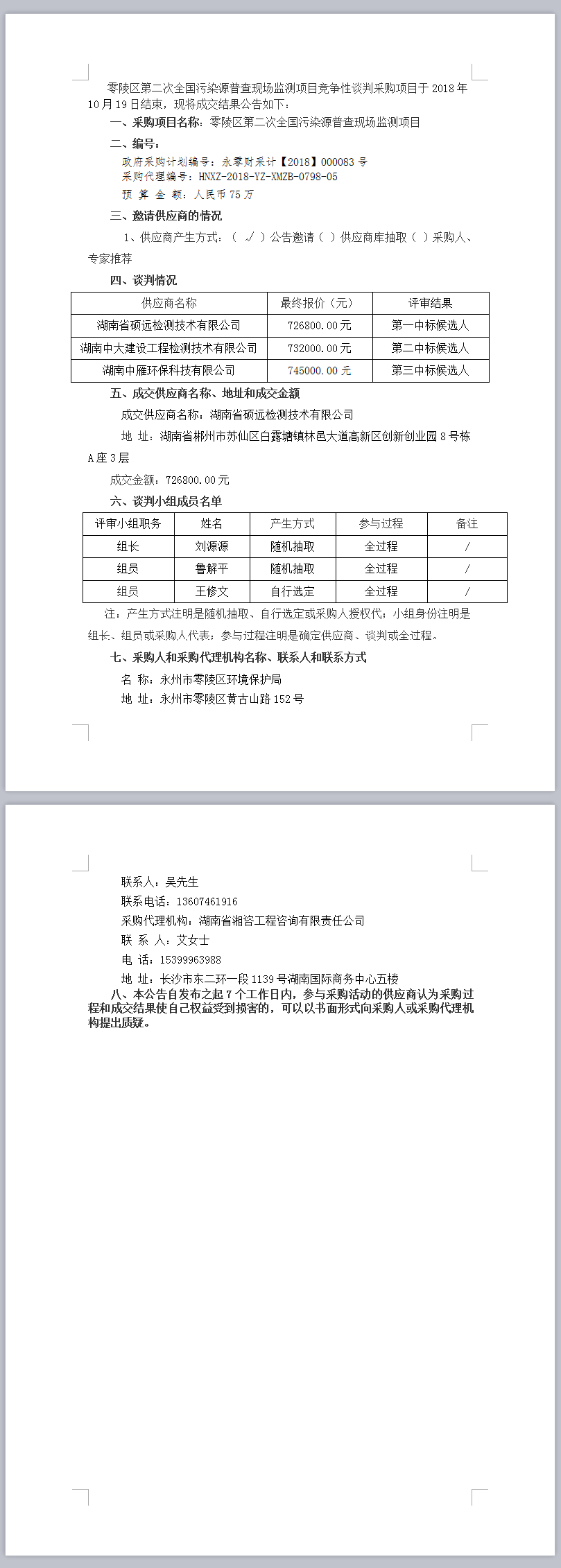 零陵区第二次全国污染源普查现场监测项目竞争性谈判成交公告