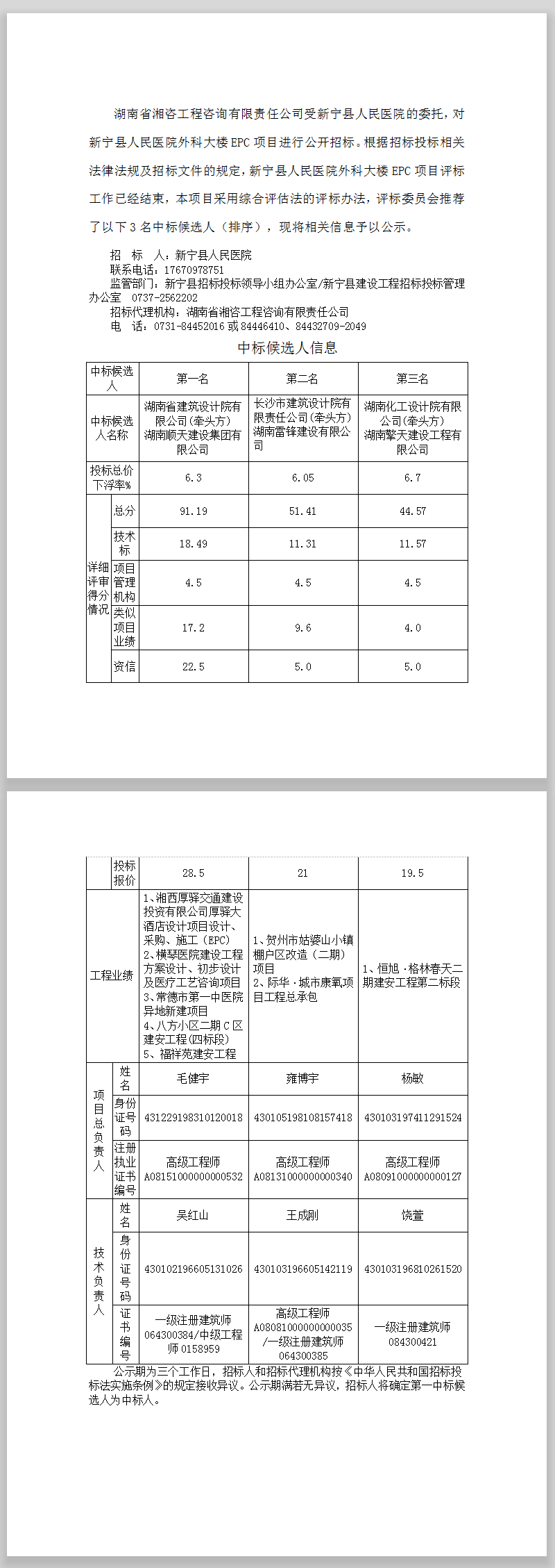 新宁县人民医院外科大楼EPC项目投标信息公示表