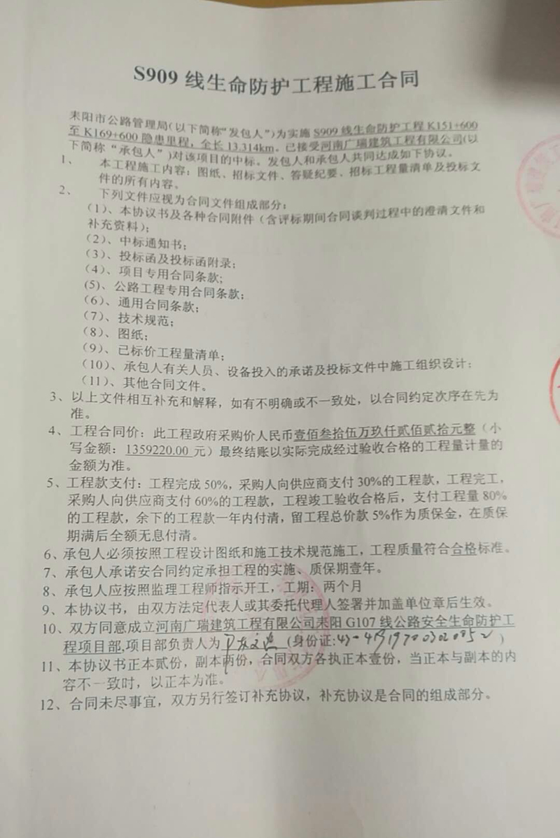 耒阳市S909线公路安全生命防护工程竞争性谈判采购合同公告