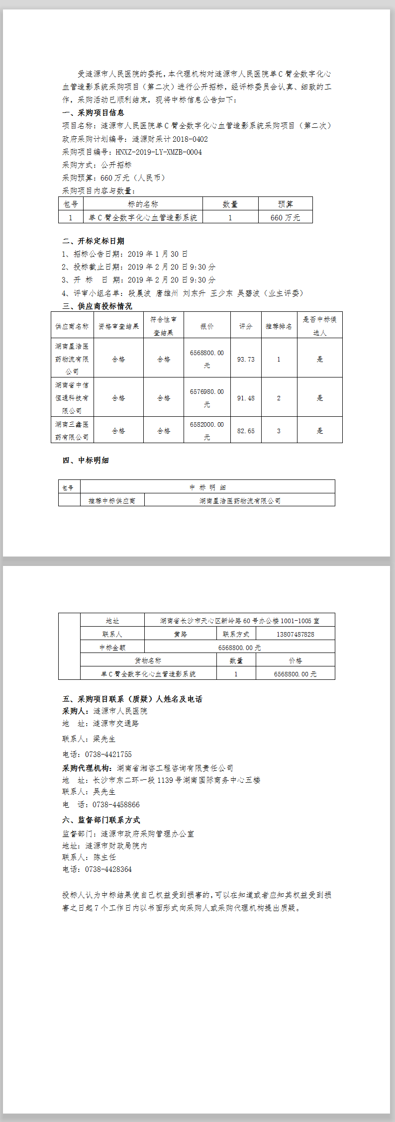 涟源市人民医院单C臂全数字化心血管造影系统采购项目(第二次)中标结果公告