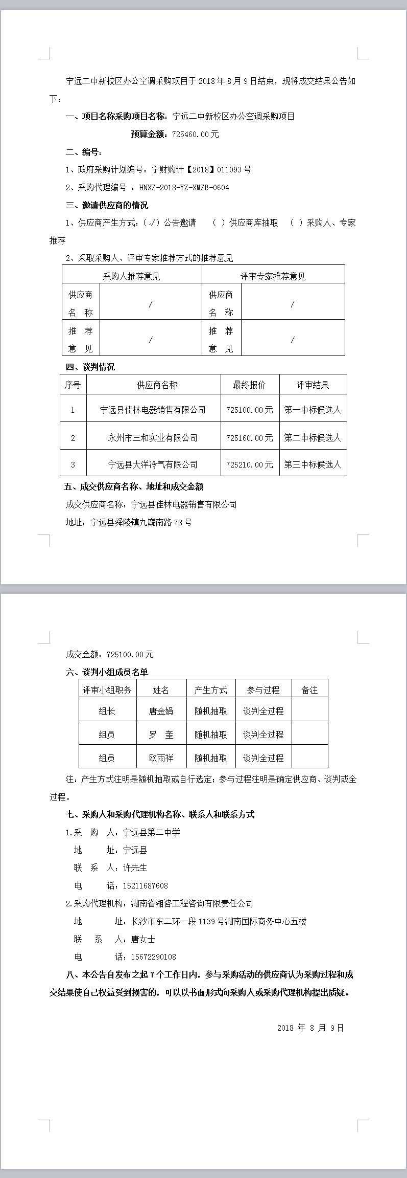 宁远二中新校区办公空调采购项目竞争性谈判成交结果公告