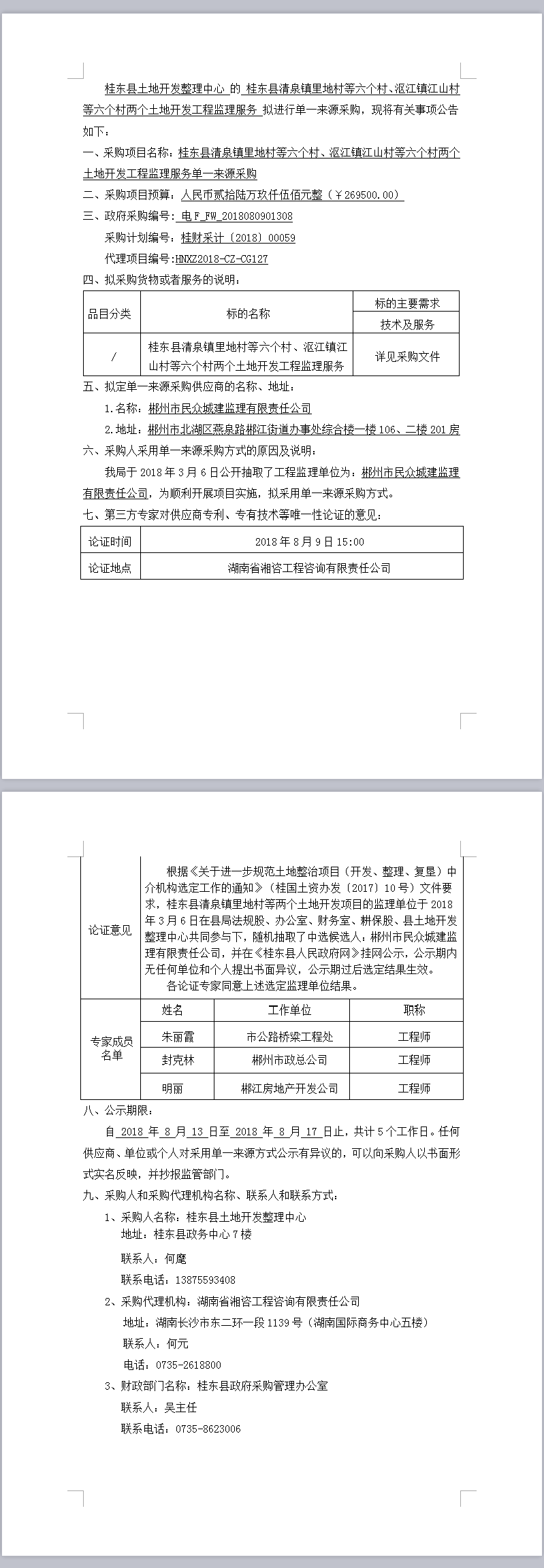 桂东县清泉镇里地村等六个村、沤江镇江山村等六个村两个土地开发工程监理服务单一来源采购公示