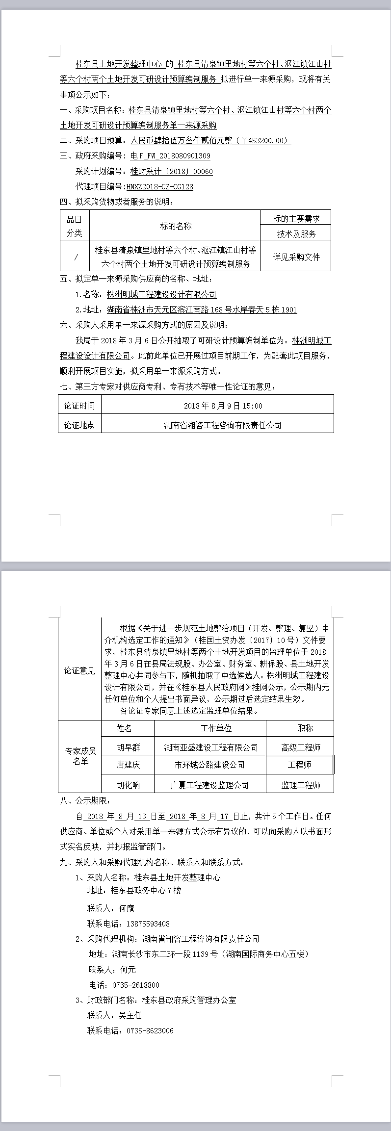 桂东县清泉镇里地村等六个村、沤江镇江山村等六个村两个土地开发可研设计预算编制服务单一来源采购公示