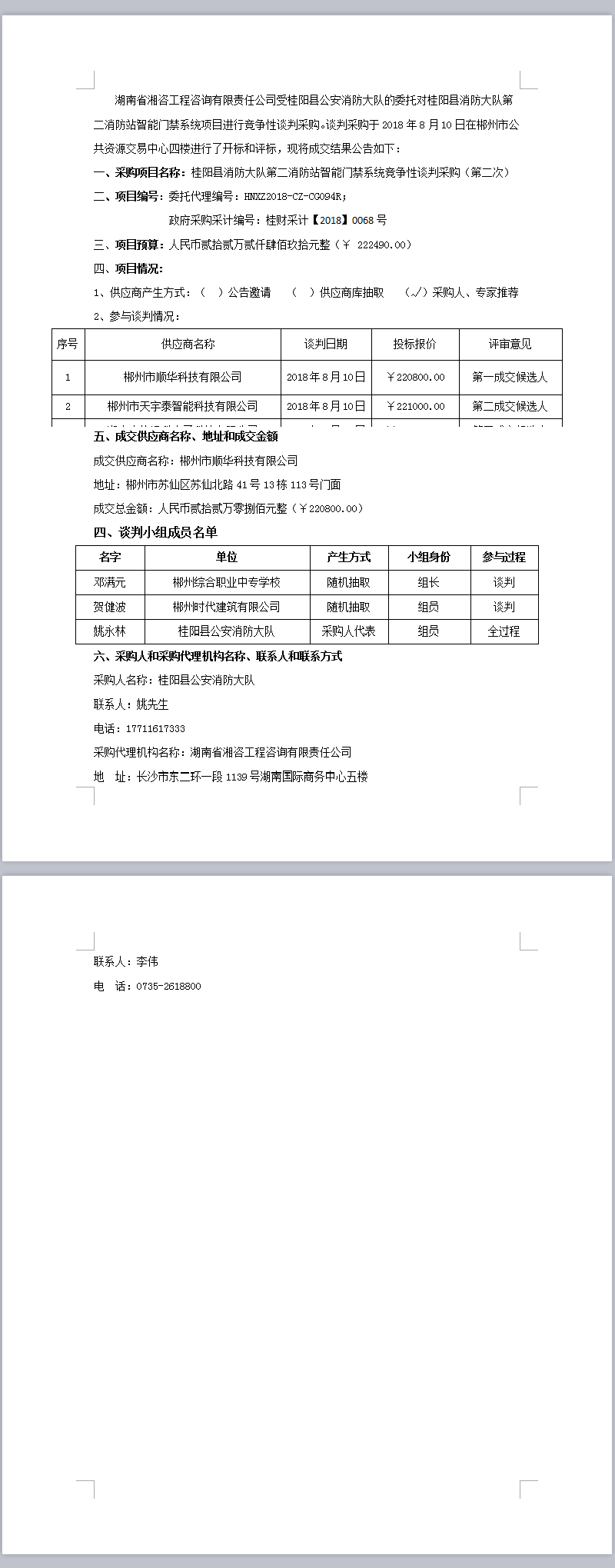 桂阳县消防大队第二消防站智能门禁系统竞争性谈判采购(第二次)成交公告