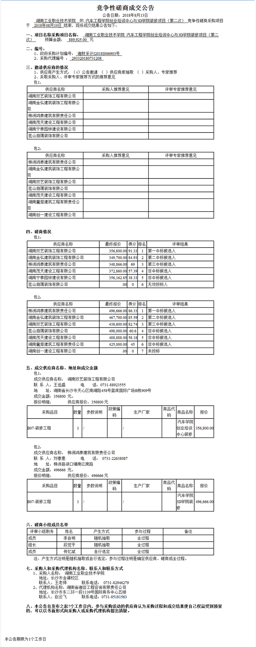 湖南工业职业技术学院汽车工程学院的创业培训中心和3D学院装修工程项目(第二次)竞争性磋商成交公告