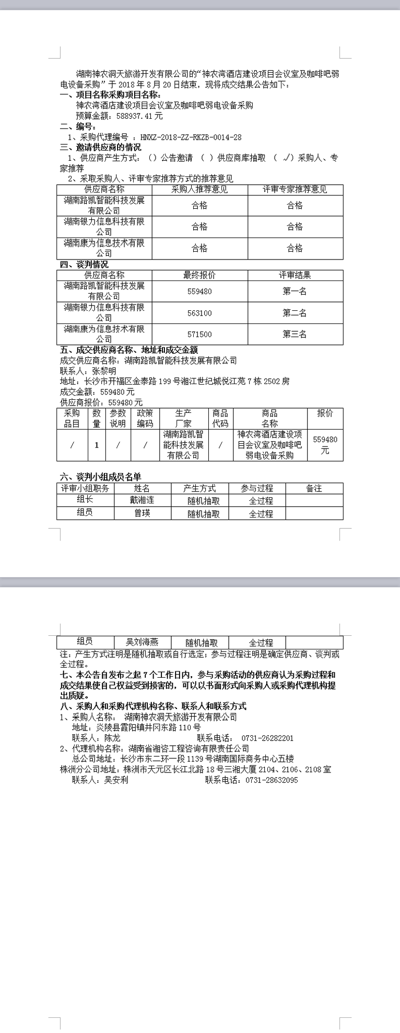 神农湾酒店建设项目会议室及咖啡吧弱电设备采购竞争性谈判成交公告