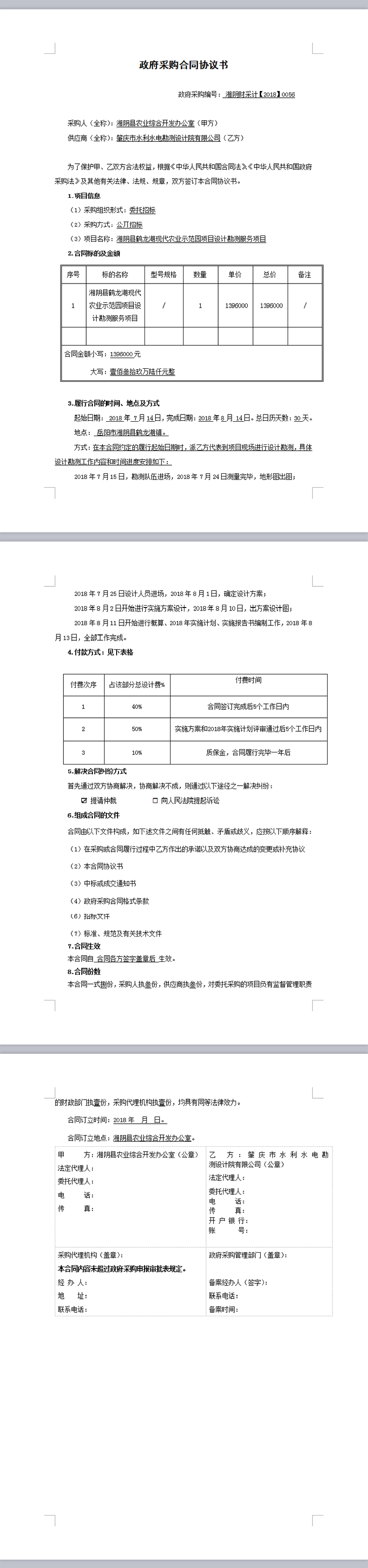湘阴县鹤龙湖现代农业示范园项目设计勘测服务项目政府采购合同协议书