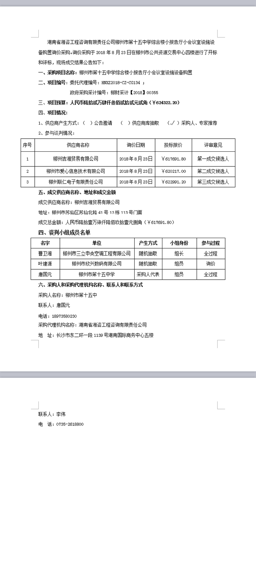 郴州市第十五中学综合楼小报告厅小会议室设施设备购置询价采购成交公告