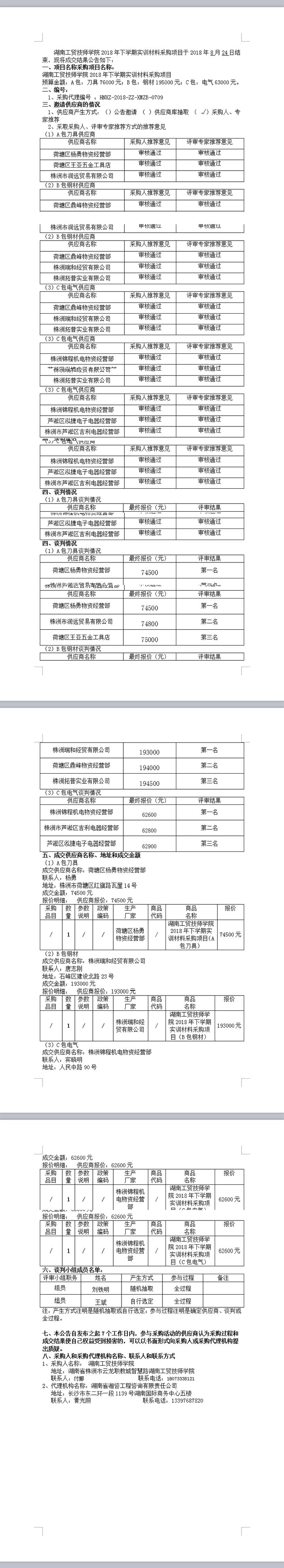 湖南工贸技师学院2018年下学期实训材料采购项目竞争性谈判成交公告