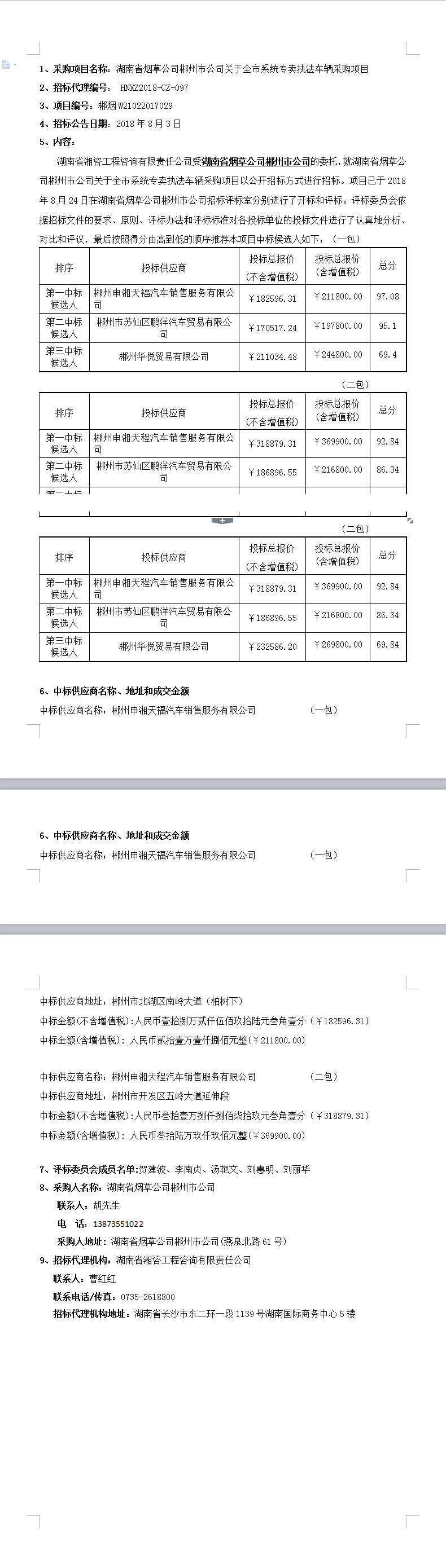 湖南省烟草公司郴州市公司关于全市系统专卖执法车辆采购项目中标结果公示