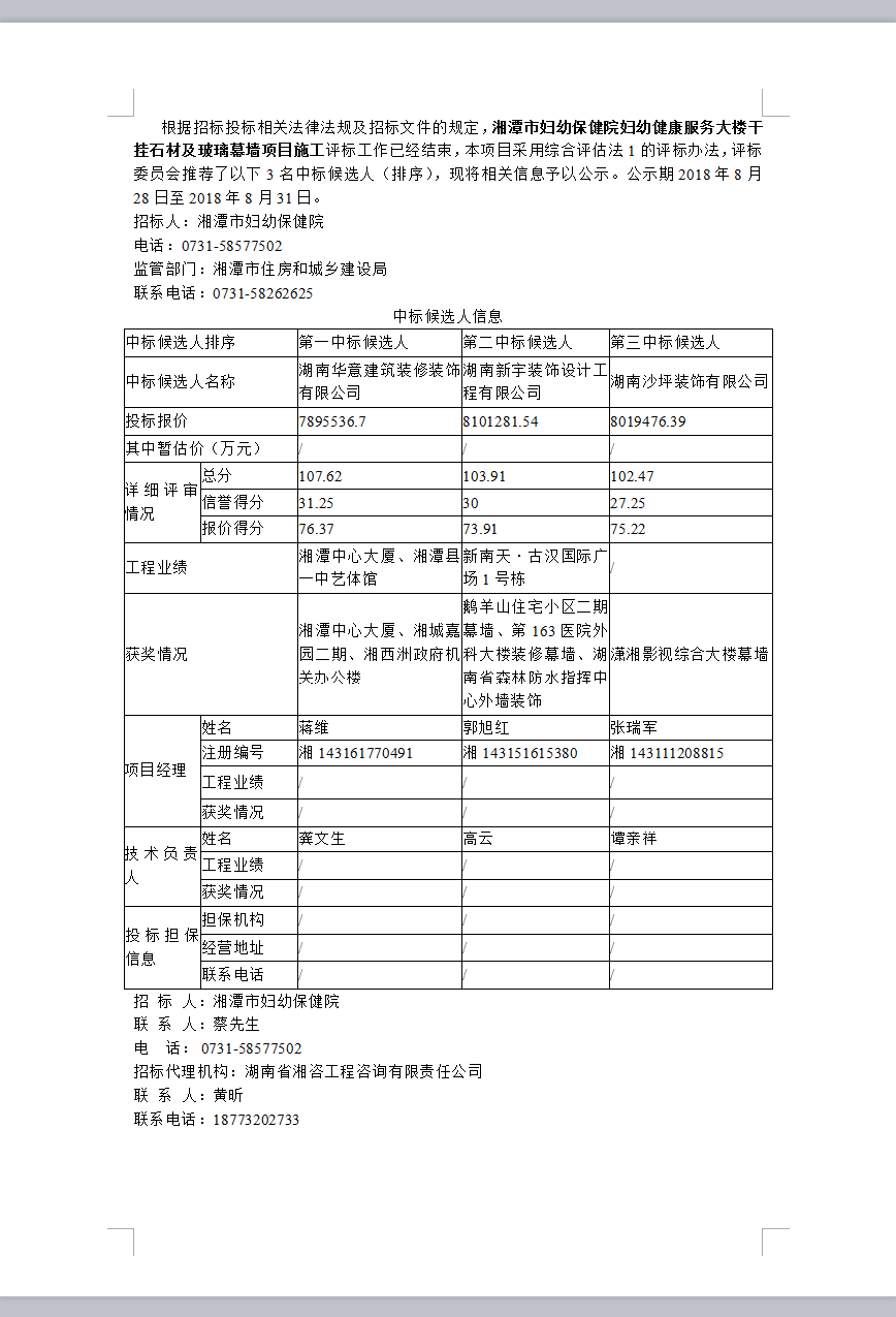 湘潭市妇幼保健院妇幼健康服务大楼干挂石材及玻璃幕墙项目施工中标候选人公示