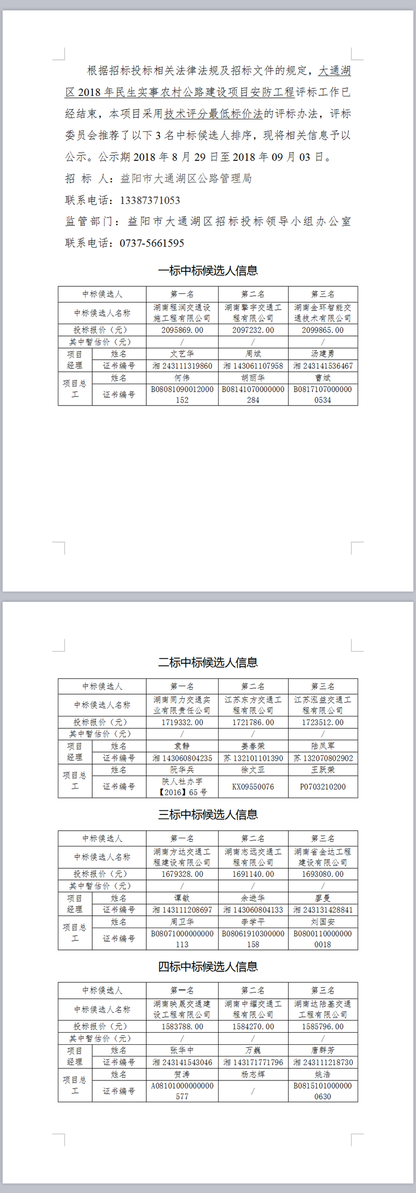 大通湖区2018年民生实事农村公路建设项目安防工程中标候选人公示