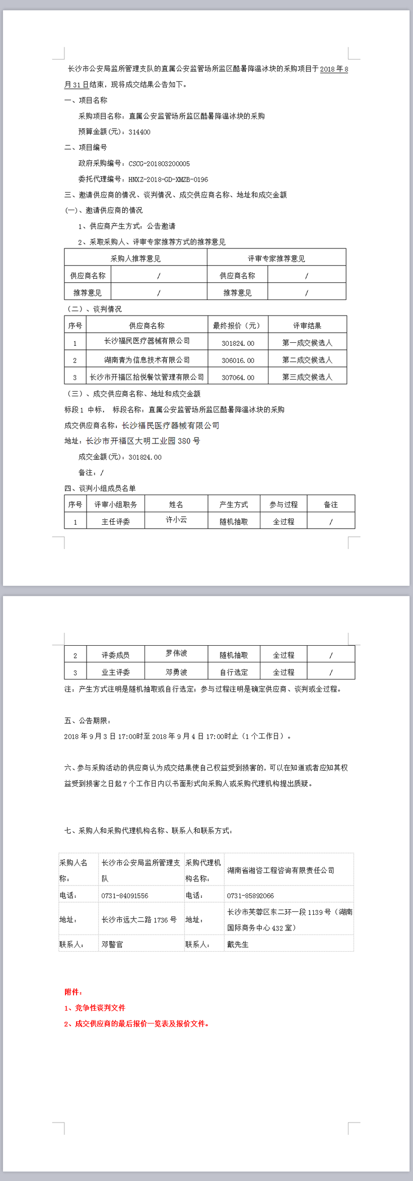 长沙市公安局监所管理支队直属公安监管场所监区酷暑降温冰块的采购结果公告