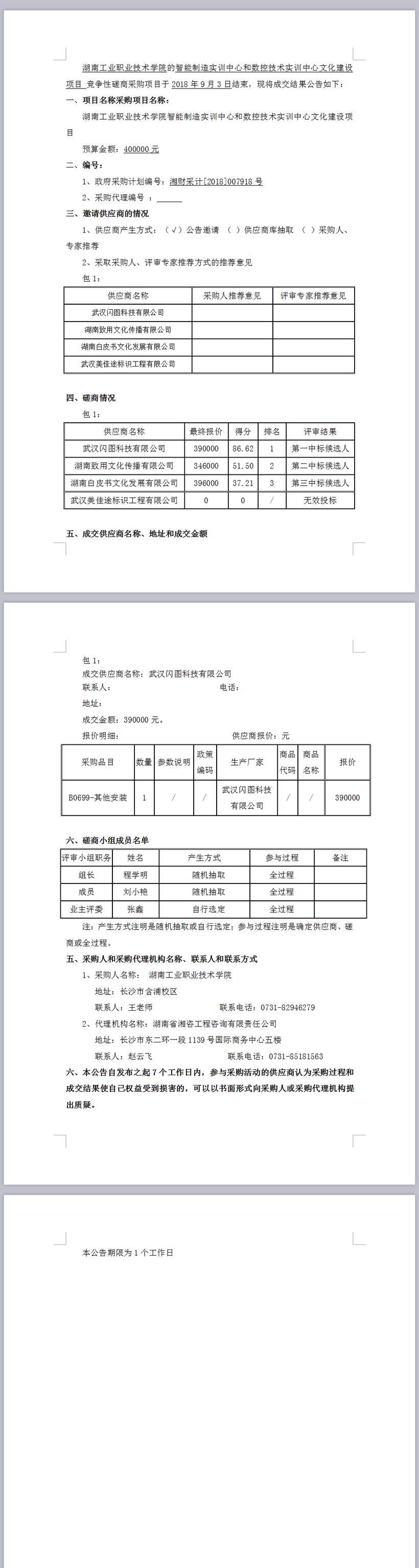 湖南工业职业技术学院智能制造实训中心和数控技术实训中心文化建设项目竞争性磋商成交公告