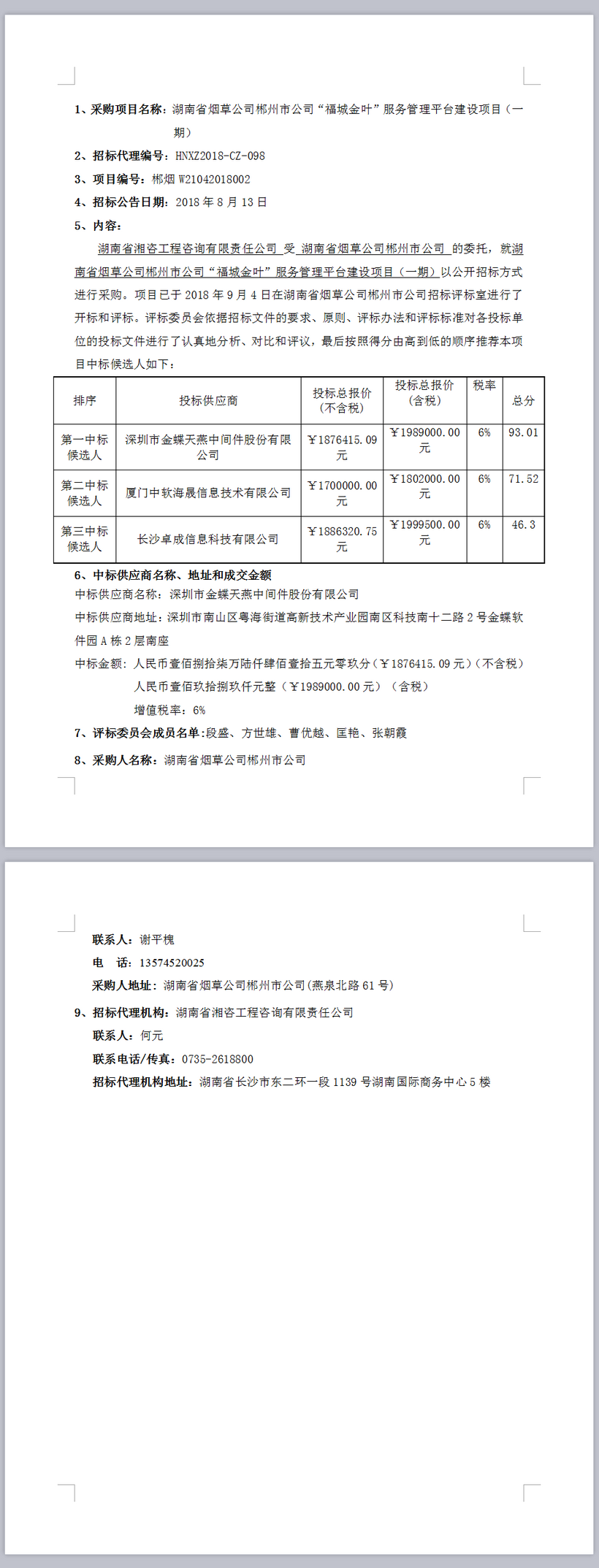 湖南省烟草公司郴州市公司“福城金叶”服务管理平台 建设项目(一期)中标结果公示